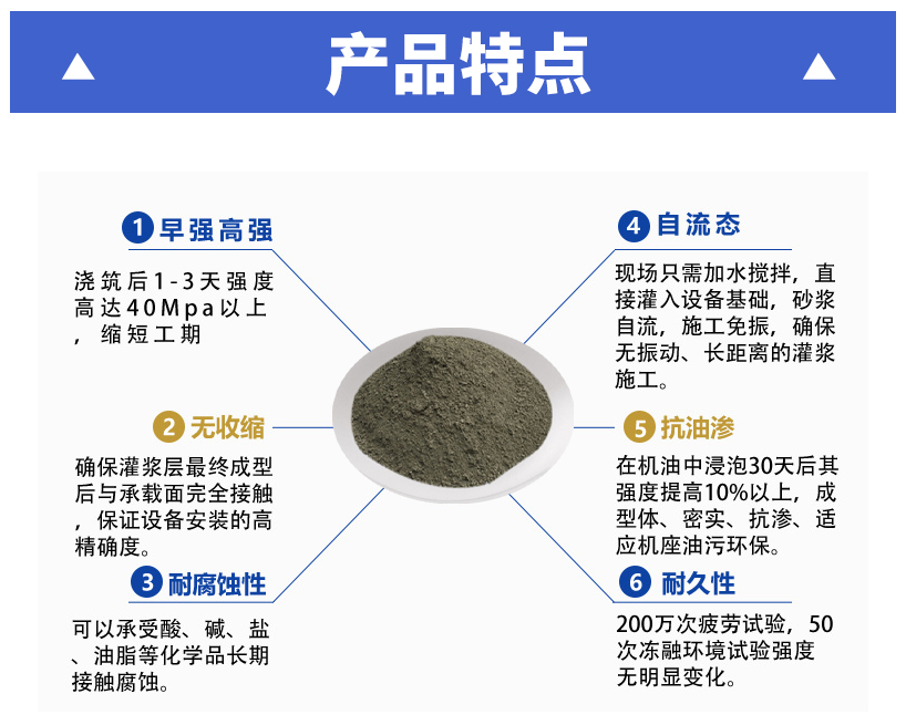 高強無收縮灌漿料是以高強度石英砂作為骨料,以水泥作為結(jié)合劑,輔以高流態(tài)、微膨脹、防離析等物質(zhì)配制而成。它在施工現(xiàn)場加入適量的水,攪拌均勻后即可使用。灌漿料具有自流性好,快硬、早強高強、無收縮、微膨脹; 無害、不老化、對水質(zhì)及周圍環(huán)境友好,自密性好、防銹等特點。從根本上改變設(shè)備底座受力情況,使之均勻地承受設(shè)備的全部荷載,從而滿足各種機械,電器設(shè)備(重型設(shè)備高精度磨床)的安裝要求,是無墊安裝時代的灌漿材料。