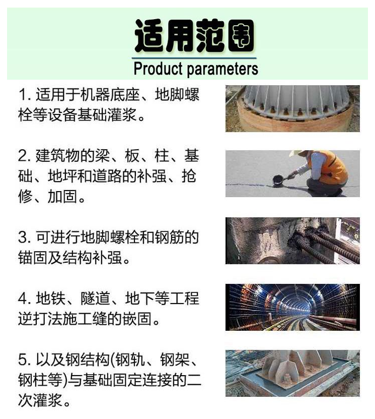 機器底座、鋼結(jié)構(gòu)與地基懷口、設(shè)備基礎(chǔ)的二次灌漿、栽埋鋼筋、混凝十結(jié)構(gòu)加固和改造,舊混凝土結(jié)構(gòu)的裂縫治理,機電設(shè)備安裝,軌道及鋼結(jié)構(gòu)安裝,靜力壓樁工程封樁,建筑加固,梁柱截面加大、墻體結(jié)構(gòu)的加厚及漏滲水的修補,各種基礎(chǔ)工程的塌陷灌漿以及各種搶修工程等。